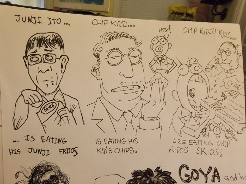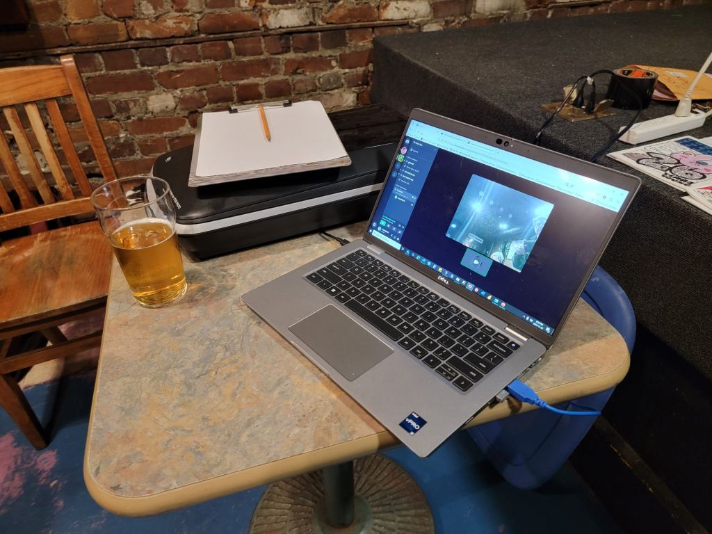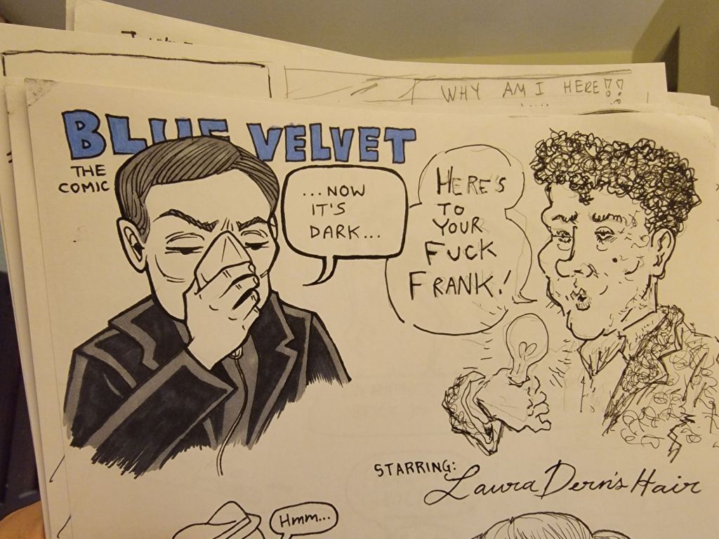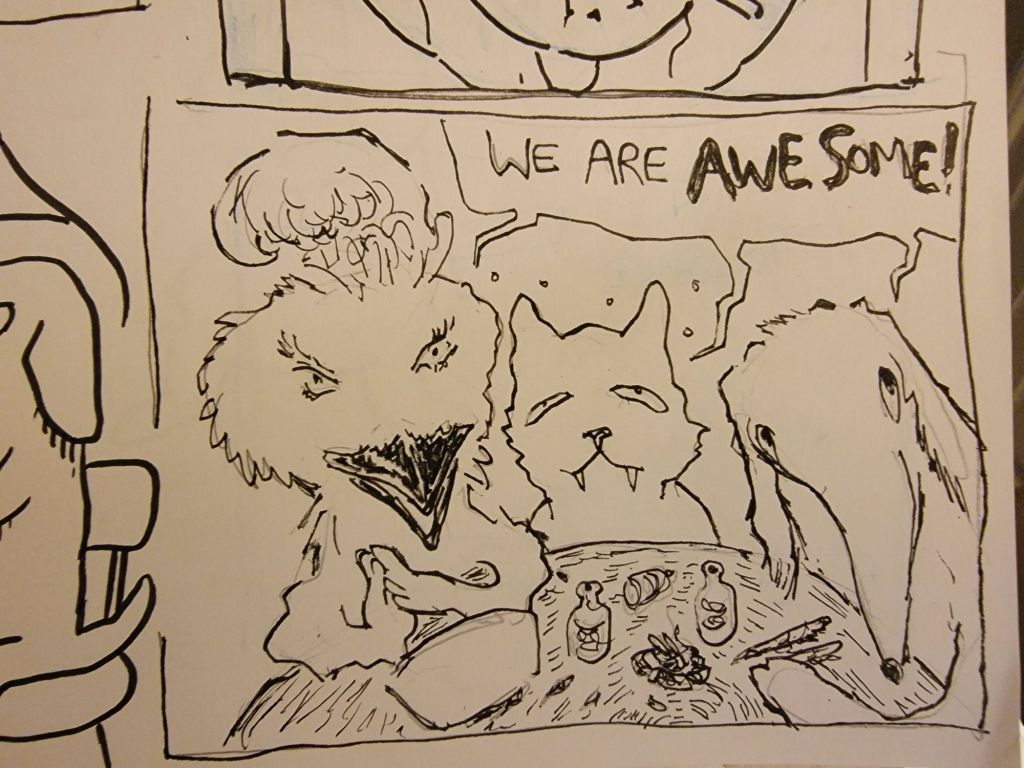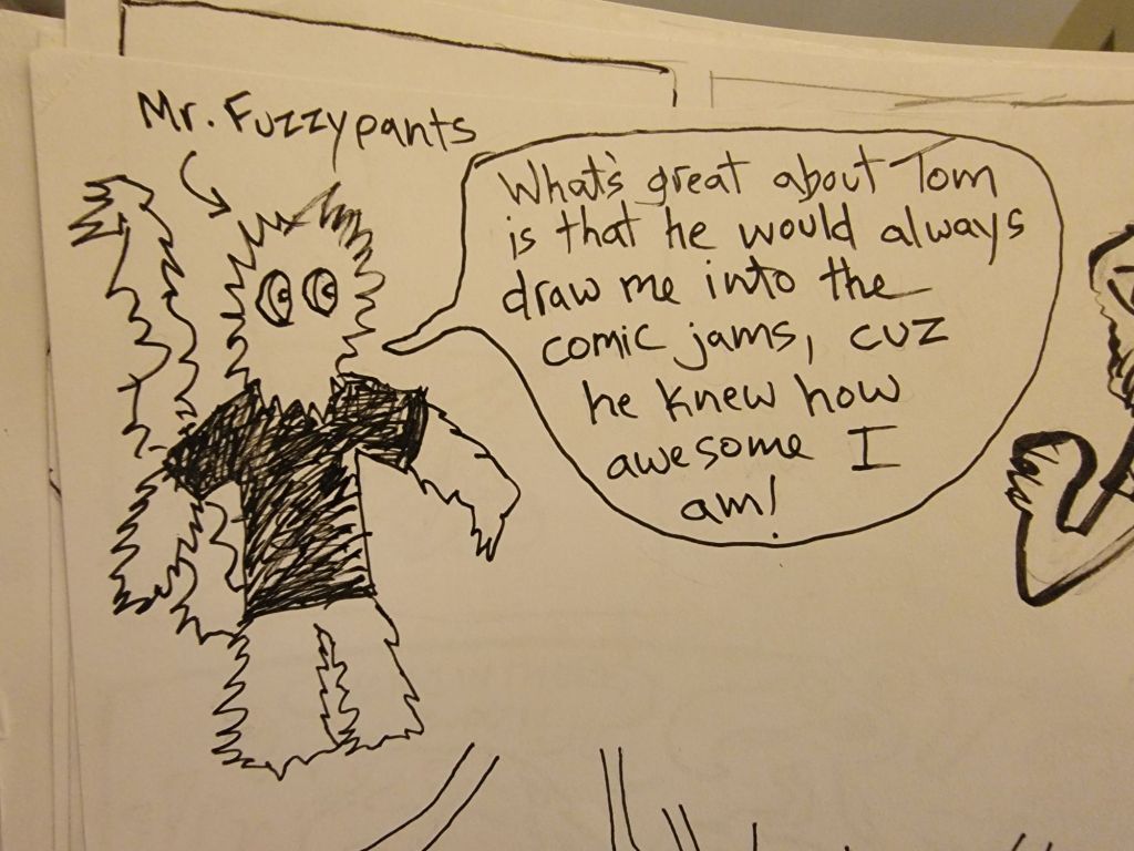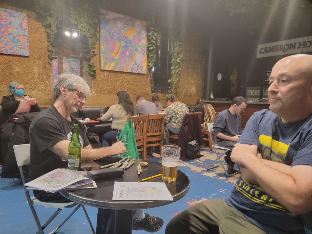 The 28th Anniversary of the jam was a great night with a nice turnout, over 20 pages were finished! Woo hoo! Francis brought some amazing home baked goodies, and he and Mip let us use their phones to play their favourite Spotify lists. Dave H set up a laptop and scanner and connected to the jam Discord for anyone who wanted to join in (full disclosure, it was a last-minute decision and there were no takers this time) and brought in some real life examples of the Tshirts we now have.