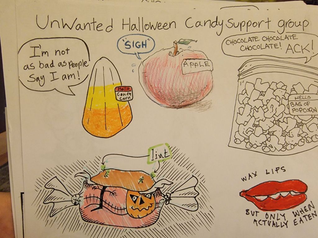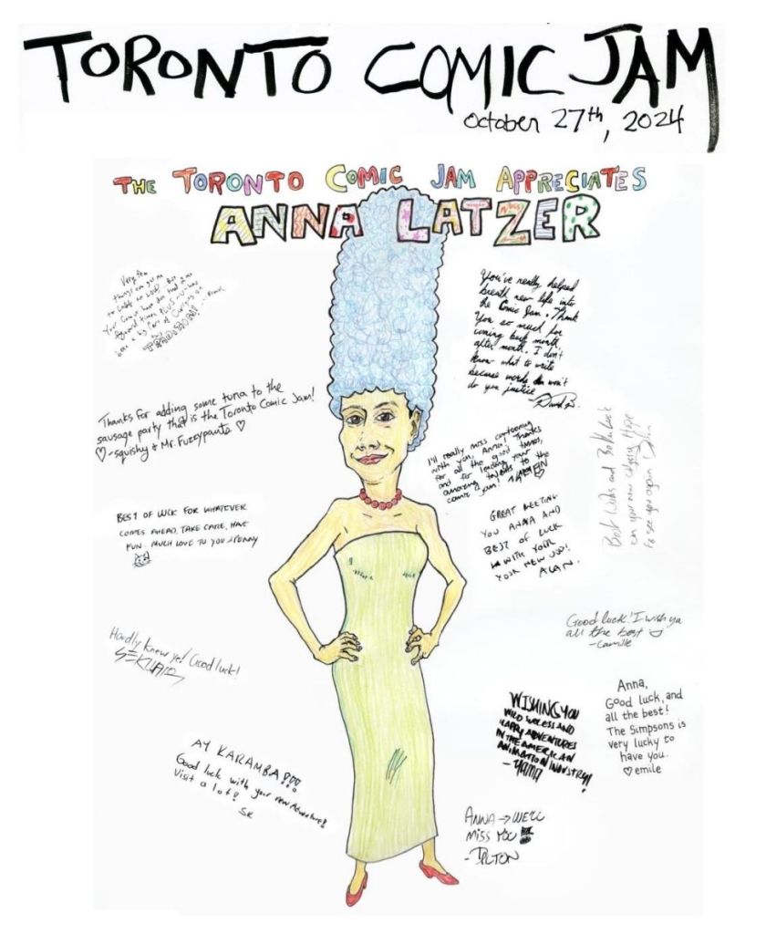 Here is a thumbmail of the cover for last month’s last-minute jam after the warm and wonderful, packed memorial for Tom King. This jam book is pretty small, but it is full of love. Frank drew this colour drawing of Anna as Marge for everyone to sign for her going away party at August’s jam, and we are putting it on October’s cover, finally. We miss you Anna!