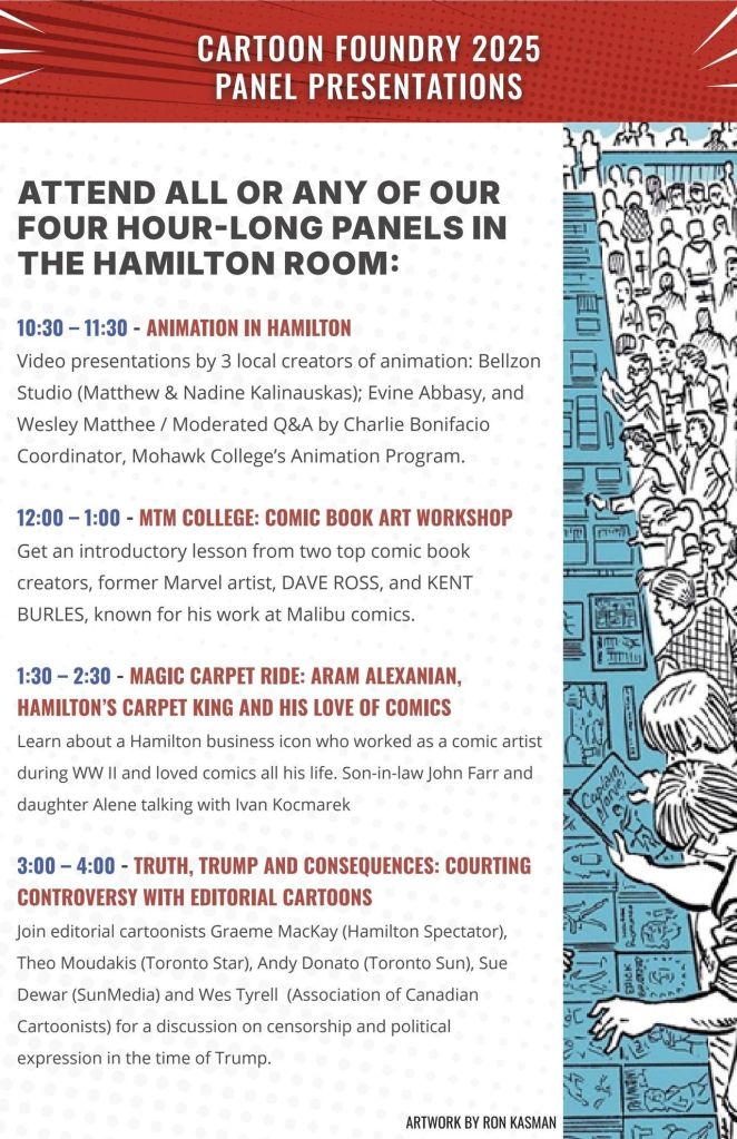 Celebrate the Art of Cartooning in Hamilton. The Cartoon Foundry is a not-for-profit, art-focused event that promotes and celebrates the art of cartooning in Hamilton. We aim to create a vibrant and inclusive community for cartoonists of all levels and backgrounds, while fostering appreciation and understanding of the medium and its rich history in Hamilton.