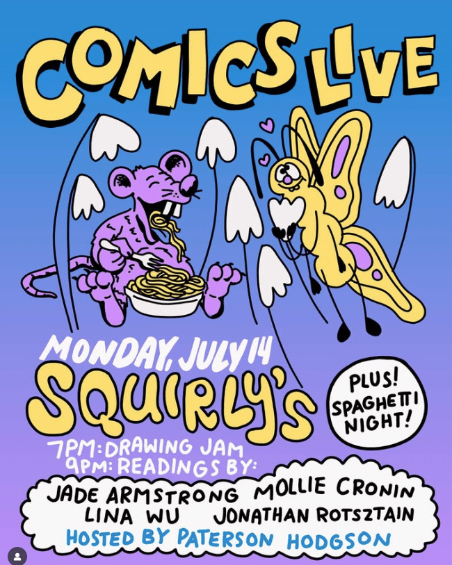 From the magic of Instagram hosted by Paterson Hodgson! Fun Monday Party Alert – July 14 join us on the back patio at @squirlys for drawing and comic readings. 7-9pm Drawing Jam + Spaghetti specials night9pm (sundown) Comic readings ! If you haven’t seen a comic reading before, we will be projecting comics on a screen andContinueContinue reading “TONIGHT! Drawing and Comics Readings at Squirly’s! 7pm!”